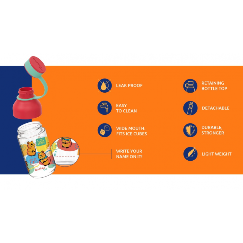 Detská fľaša Quokka Ice Kids s dvojitým otváraním umožňuje vloženie kociek ľadu či kúskov ovocia a zároveň sa ľahko čistí. 100% tesniace, skrutkovacie uzávery chránia obsah fľaše pred vyliatím. Pútko uľahčuje prenášanie a zároveň chráni uzáver pred stratením.
