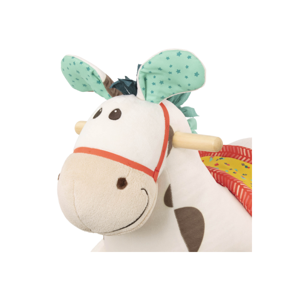Rozkošný plyšový hojdací kôň s drevenou základňou a držadlami. Počas hojdania sa ozýva klapot konských kopýtok.