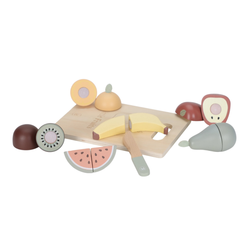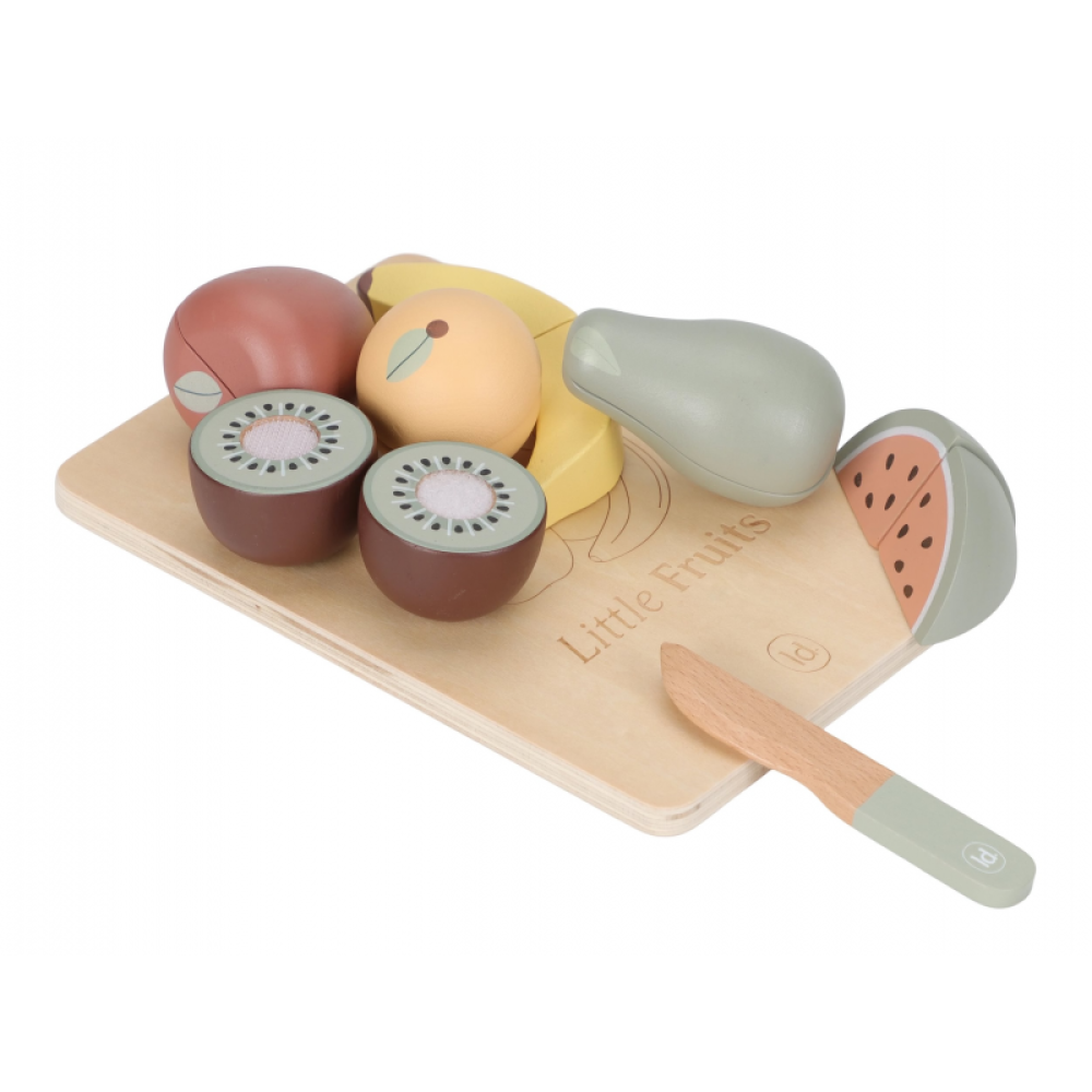 Pripravte ovocnú desiatu s touto veselou sadou dreveného krájacieho ovocia! V sade nájdete šesť druhov ovocia: jablko, hrušku, banán, kivi, pomaranč a kúsok melónu – každý z nich je možné rozkrojiť dreveným nožíkom na dve polovice a vďaka suchému zipsu ich opäť ľahko spojíte späť.