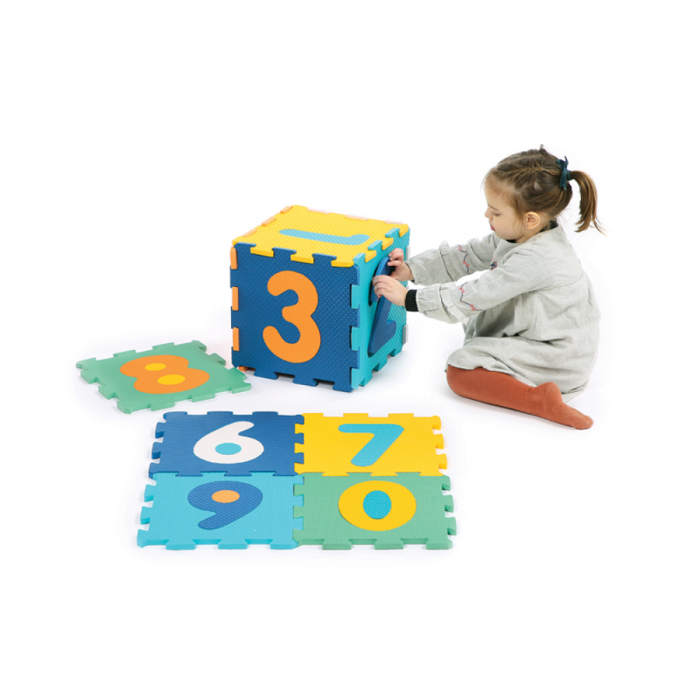 Sada deviatich rôznofarebných penových puzzle Ludi s vyberateľnými číslami slúži na hranie aj ako hracia podložka a dekorácia do detskej izby. Rôzne textúry, farby a motívy podporujú rozvoj zmyslov, motorických zručností a predstavivosti dieťaťa. V staršom veku dieťaťa sa s ich pomocou môže učiť poznávať čísla.