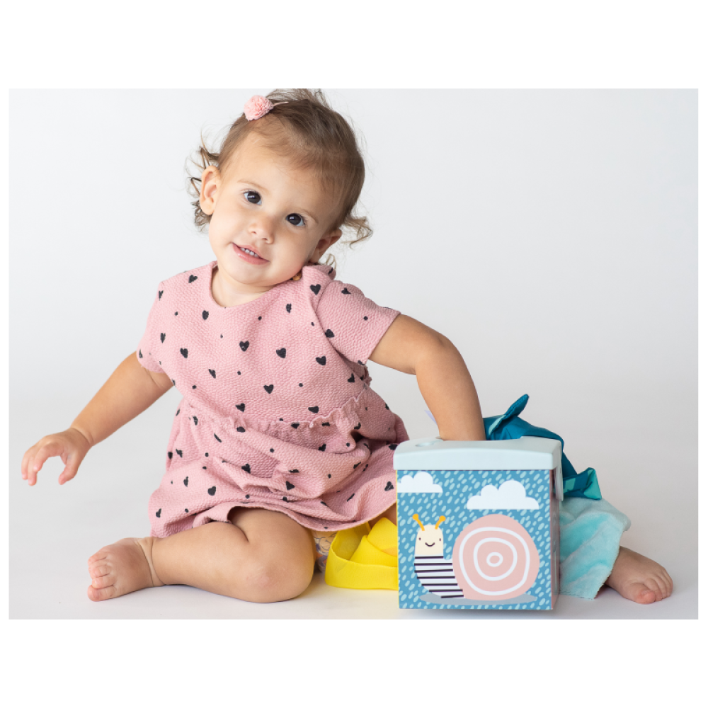 Originálny box s otvorom naplnený textilnými šatkami zaistí vášmu dieťaťu zábavu na dlhé hodiny a zároveň podporí rozvoj jeho zmyslov i jemnej motoriky.