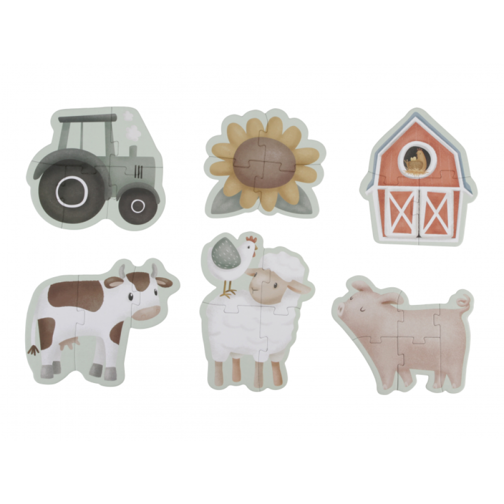 Sada obsahuje 6 variantov puzzle skladačiek pre najmenších s krásnymi ilustráciami zo života na farme. Jednotlivé skladačky majú 3, 4 alebo 5 dielikov z pevného kartónu, ktoré sú dokonale tvarované pre malé detské ručičky.