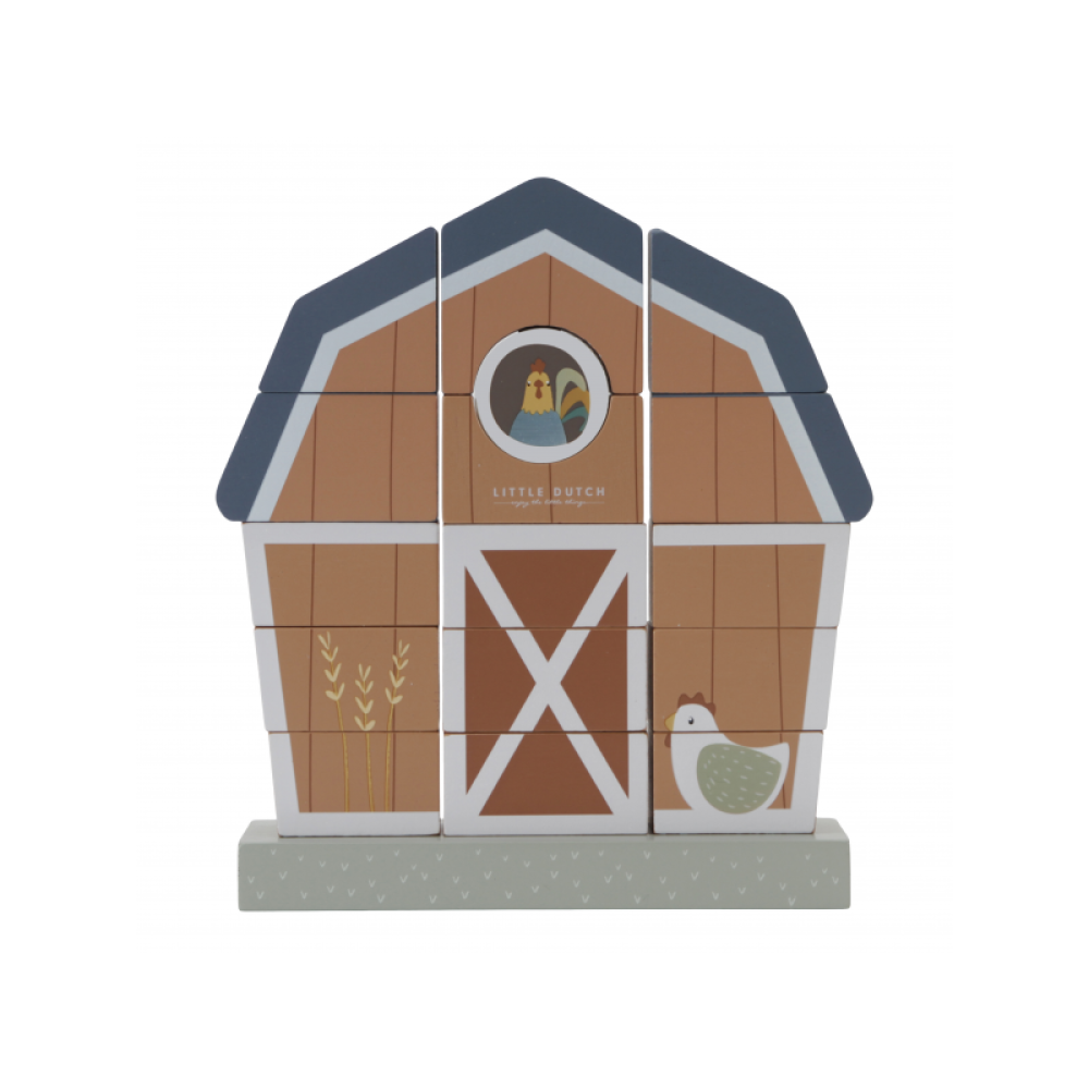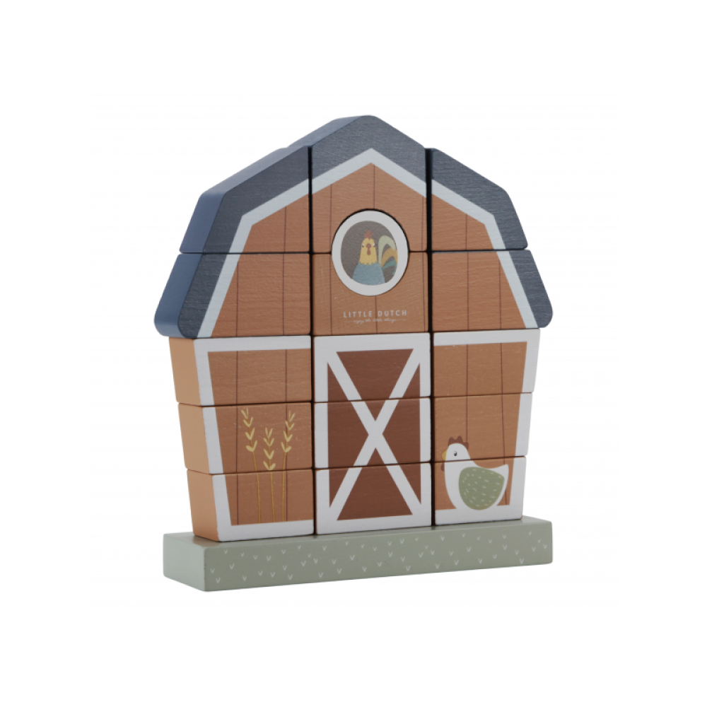 Originálna stohovacia stavebnica je tvorená základňou, na ktorú sa nasadzujú drevené dieliky. Nasadením dielikov v správnom poradí dieťa postaví budovu farmy. Hračka pomáha rozvíjať koordináciu oko-ruka a jemnú motoriku vášho dieťaťa.