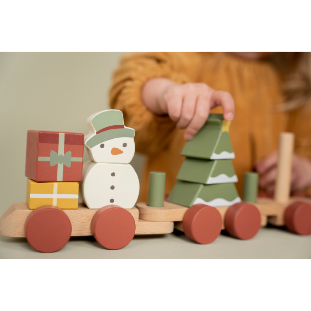 Špeciálna vianočná edícia dreveného vláčika z dielne Little Dutch. Vláčik sa skladá z kociek rôznych tvarov a farieb s vianočnými motívmi, s pomocou ktorých môže vaše dieťa zostavovať rôzne varianty vagónov.
