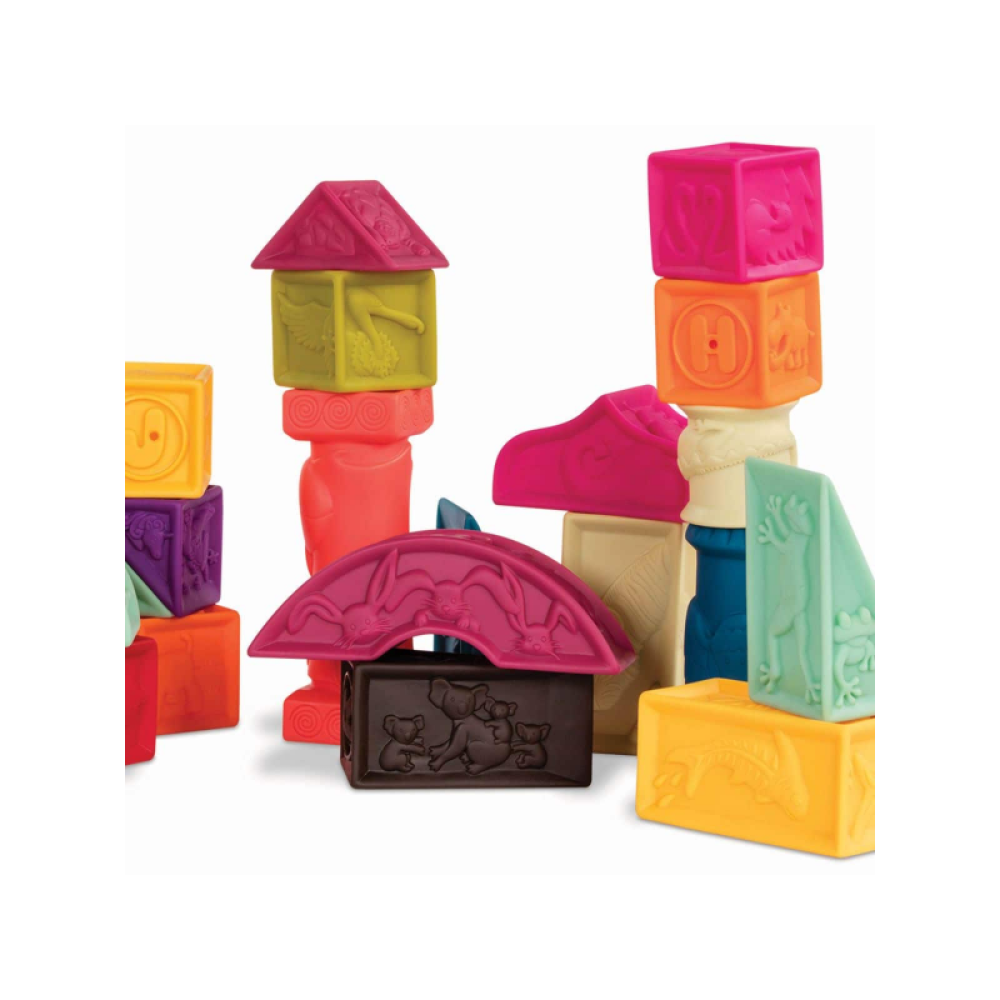Sada 26 rôznofarebných kociek a tvarov s písmenami a zvieratami Elemenosqueeze od B.toys. Kocky sú vyrobené z mäkkého plastového materiálu a po stlačení pískajú. Rôznorodé textúry kociek lákajú na skúmanie rukami i ústami, neskôr si dieťa s kockami bude hádzať, stavať z nich, učiť sa písmenká a názvy zvieratiek.