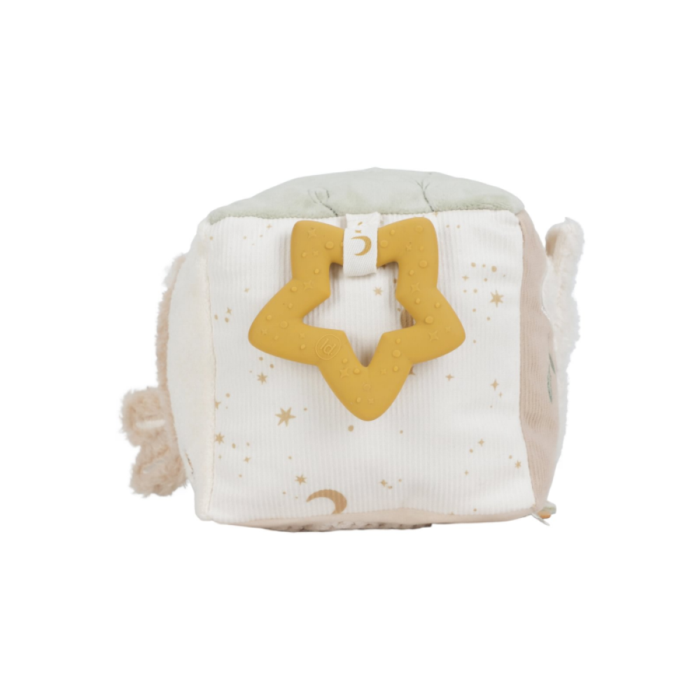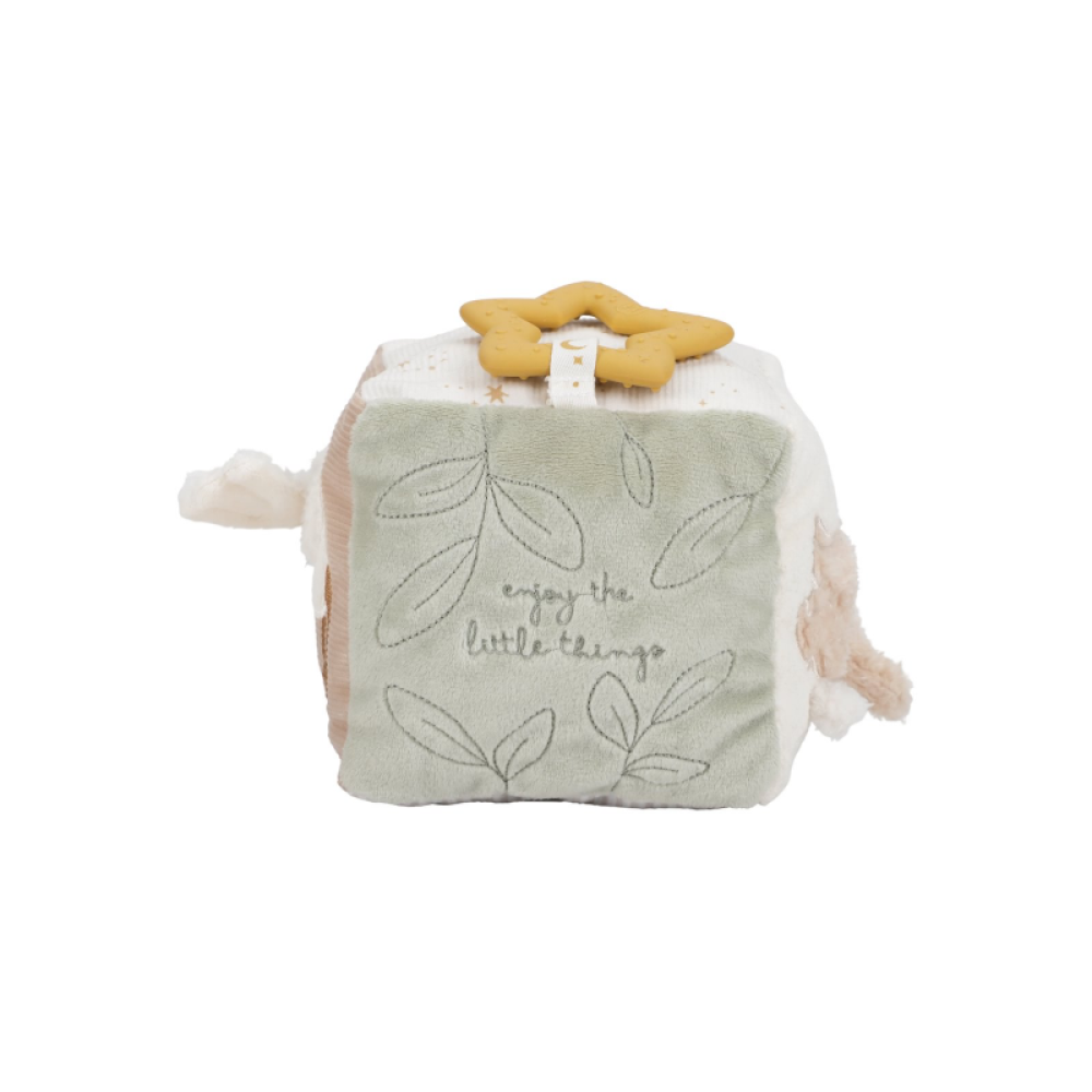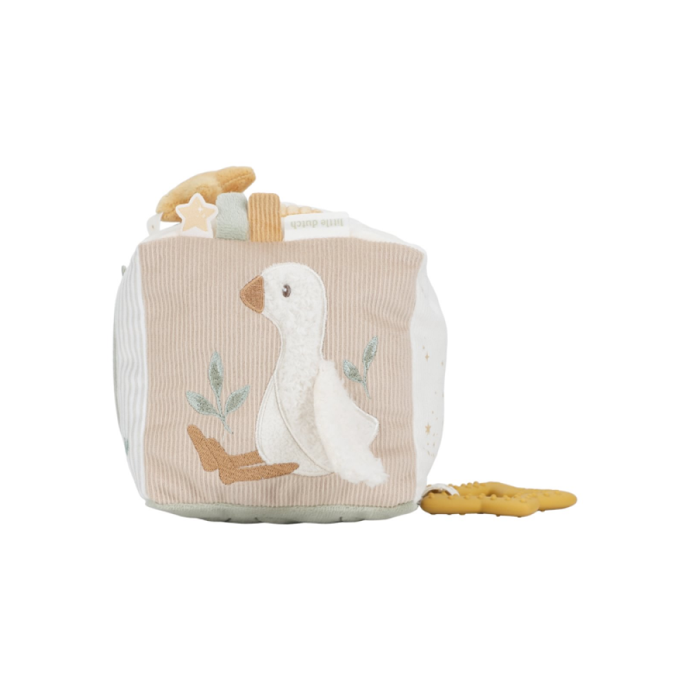 Mäkká plyšová kocka s krásnymi motívmi zo života husi a králika je vďaka svojmu prevedeniu ľahko uchopiteľná malými detskými ručičkami. Rôznorodé textúry, pripevnené hračky a vyšívané ilustrácie lákajú dieťa na skúmanie, kocka navyše pri pohybe jemne cinká.