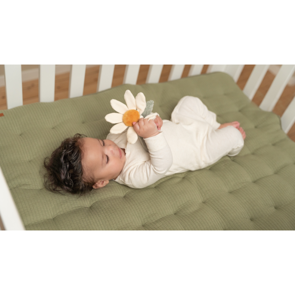 Plyšový hrkajúci kvietok so šuštiacimi okvetnými lístkami má tvar pre jednoduché uchopenie detskými ručičkami.