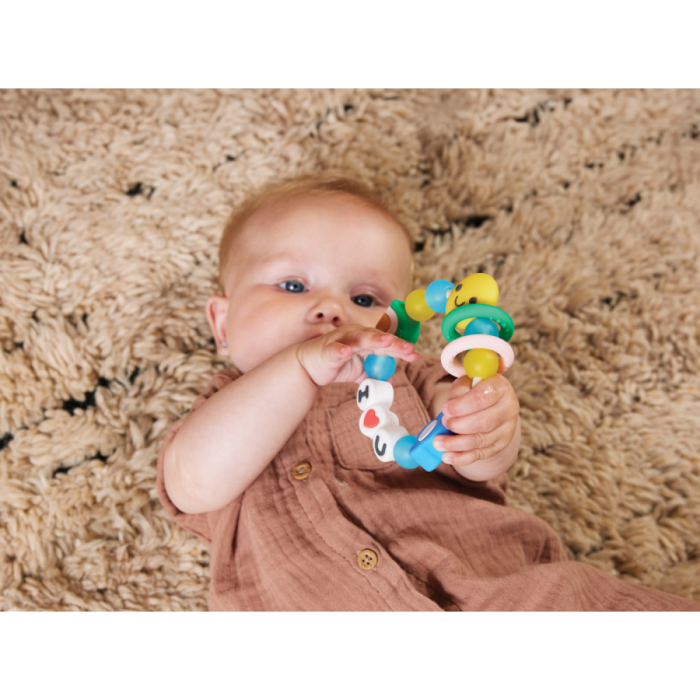 Krásne hryzátko v podobe náramku je vyrobené z pružného mäkkého silikónu. Rôznorodé textúry lákajú dieťa na skúmanie v ústach, masírovaním ďasien hryzátko pomáha dieťaťu pri prerezávaní prvých zúbkov.