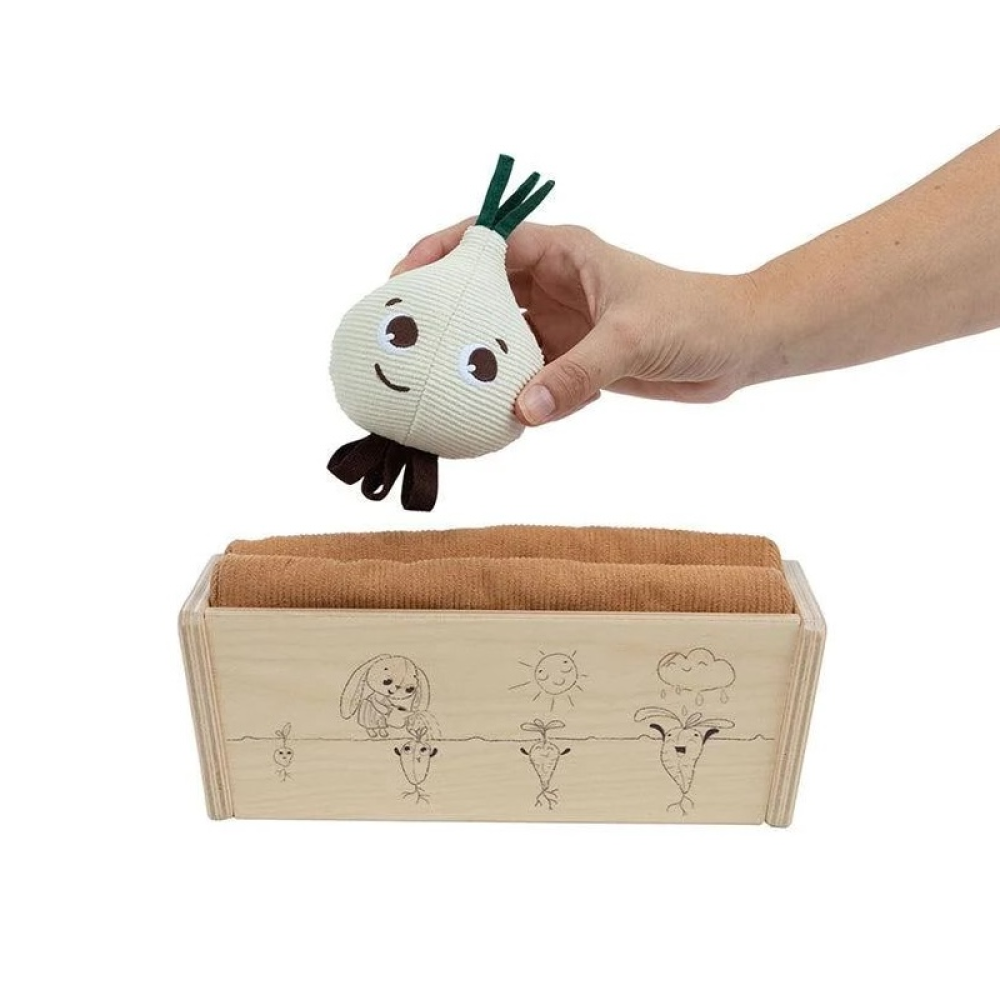 Záhradku tvorí drevený kvetináč, tri kusy zeleniny s veselými tvárami vyrobené z mäkkého textilného materiálu a drevená kanvička.