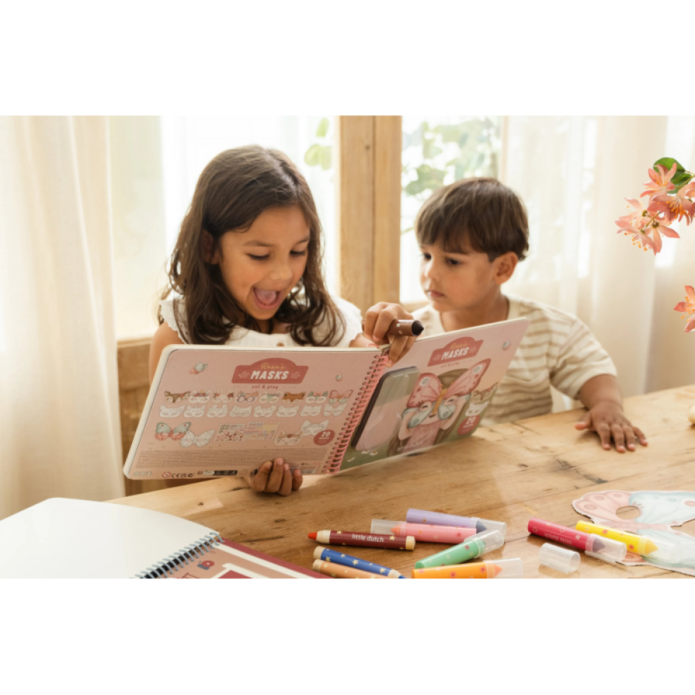 Originálna kreatívna kniha Little Dutch otvára deťom svet fantázie, farieb a hier. Obsahuje 20 krásnych vystrihávacích masiek, ktoré si deti po vystrihnutí dozdobia a použijú pri hraní divadielka či prezliekanie za rôzne rozprávkové postavy. Súčasťou balenia sú bezpečné detské nožnice, vďaka ktorým môžu deti masky vystrihovať samostatne a bez rizika.
