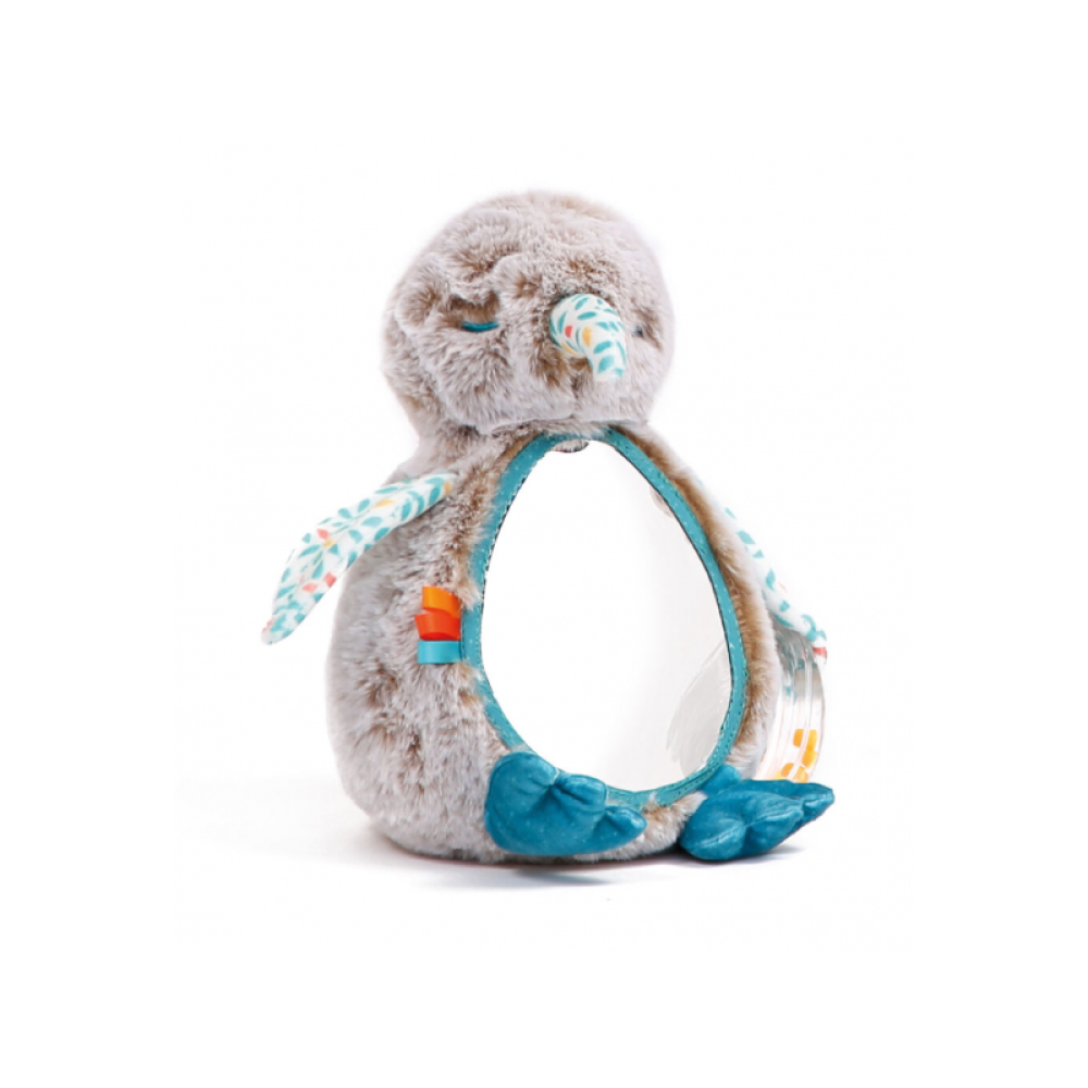 Mäkká plyšová hračka v podobe rozkošného kiwi so zrkadielkom, šnúrkou s korálkami a chrastiacimi krúžkami s guličkami láka k maznaniu i skúmaniu a objavovaniu.