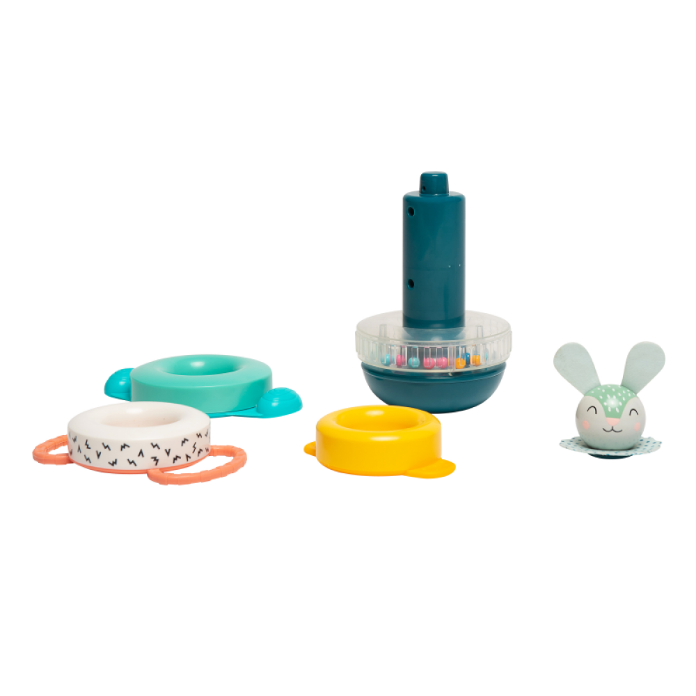 Pyramída je tvorená guľatou základňou a nasadzovacími krúžkami rôznych farieb a veľkostí. Dieťa sa snaží umiestniť krúžky v správnom poradí a vytvoriť z nich pyramídu. Ako posledný príde na rad hlavička zajačika. Najväčší krúžok je priehľadný a naplnený chrastiacimi korálkami, ďalšie tri krúžky majú držadlá rôznych tvarov uľahčujúcich ich uchopenie.