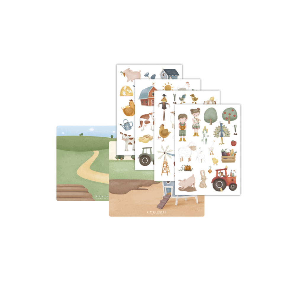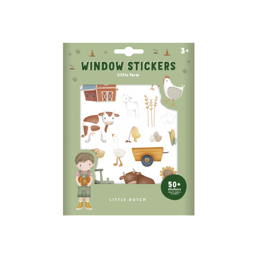 Snímateľné samolepky v podobe motívov zo života na farme z kolekcie Little Dutch Farma sú určené na použitie na okne, zrkadle či na priloženej papierovej štvrtke s natlačeným pozadím. Samolepky je možné ľahko odlepiť a použiť opakovane.