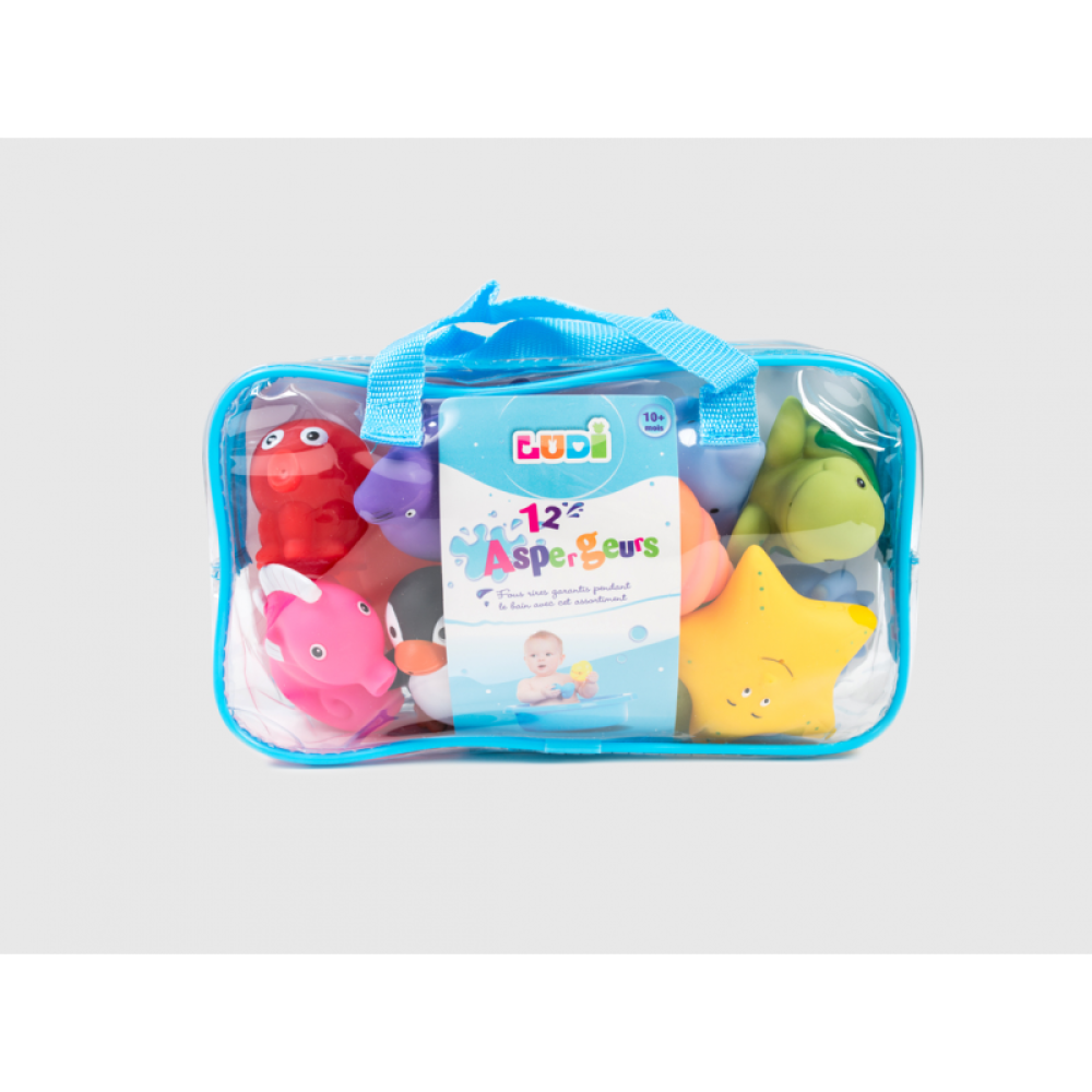 Sada 12 striekacích hračiek Ludi pre zábavu počas kúpania v praktickej úložnej taške. Vhodné od 10 mesiacov.