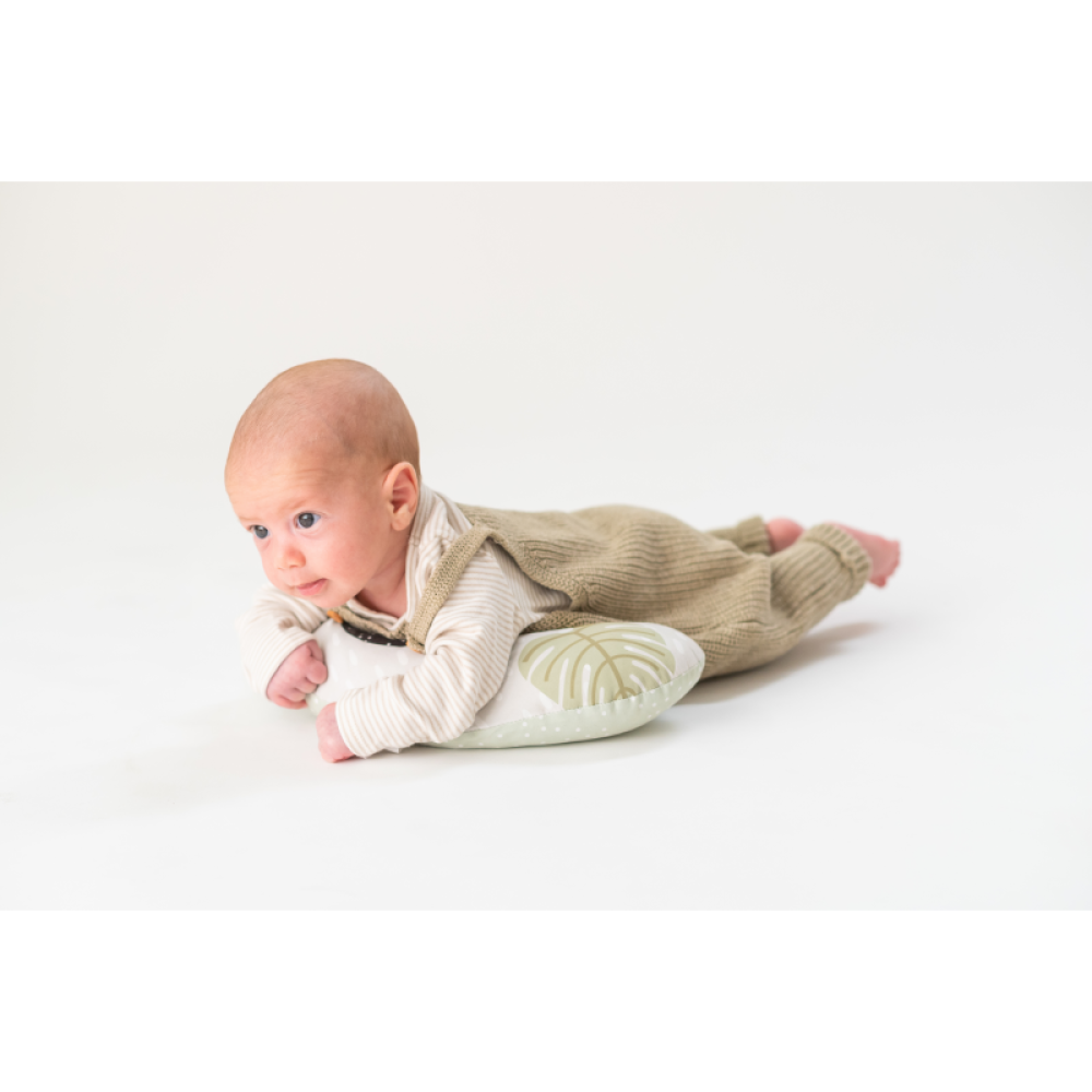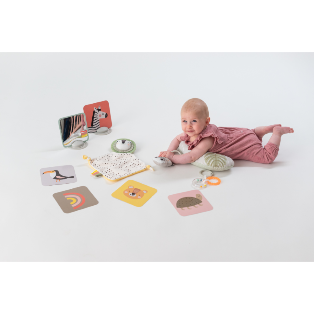 Vankúšik z mäkkého, príjemného materiálu je špeciálne navrhnutý, aby podporoval hranie dieťaťa na brušku. Súprava vysoko kontrastných obrázkov a bezpečného zrkadla s dvoma stojanmi je tiež určená na postavenie pred dieťa v polohe na brušku. Množstvo obrázkov, ktoré sada ponúka, umožňuje rodičom obrázky vymieňať a udržiavať tak dlhšie pozornosť dieťaťa. K vankúšiku je možné pripevniť aj hrkálku s hryzátkom a šuštiacu textilnú hračku v podobe roztomilého levíča.