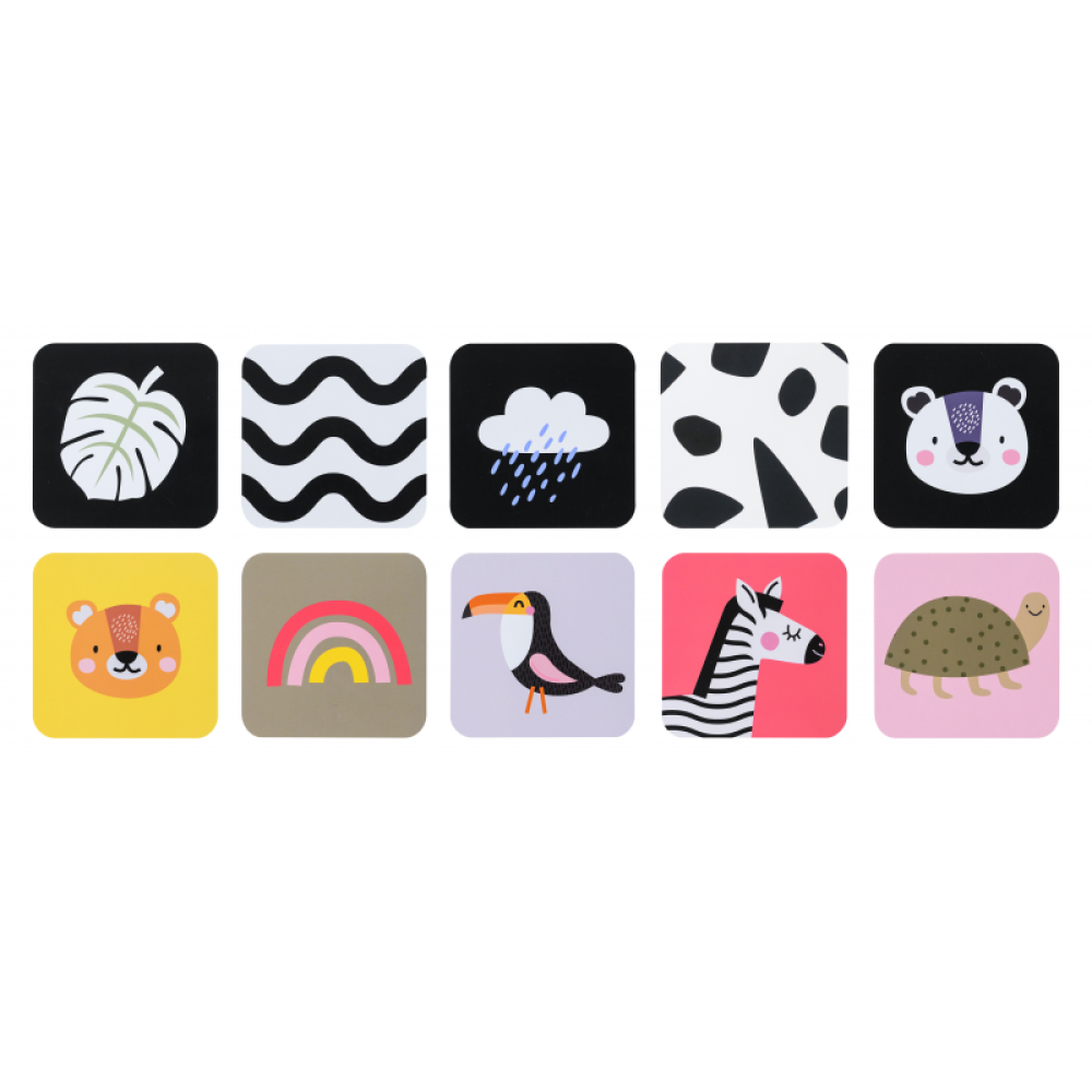 - 5 obojstranných kariet s 10 kontrastnými ilustráciami