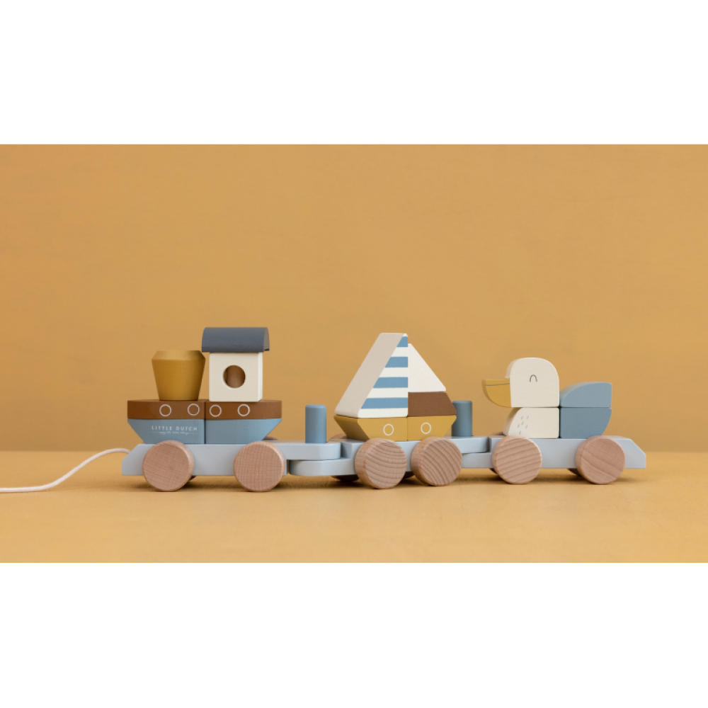 Tento drevený vlak vedený rybárskou loďou je na ceste do námorníckeho zálive. Použite svoju predstavivosť a postavte vlak pomocou skladacích kociek v rôznych tvaroch a farbách inšpirovaných prístavom. K dispozícii sú 3 vagóny s rybárskou loďou, plachetnicou a čajkou.